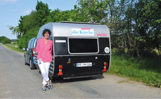 Mit dem Wohnwagen „Qek Aero“ tourt Susanne Atzenroth durch die Kirchenlandschaft