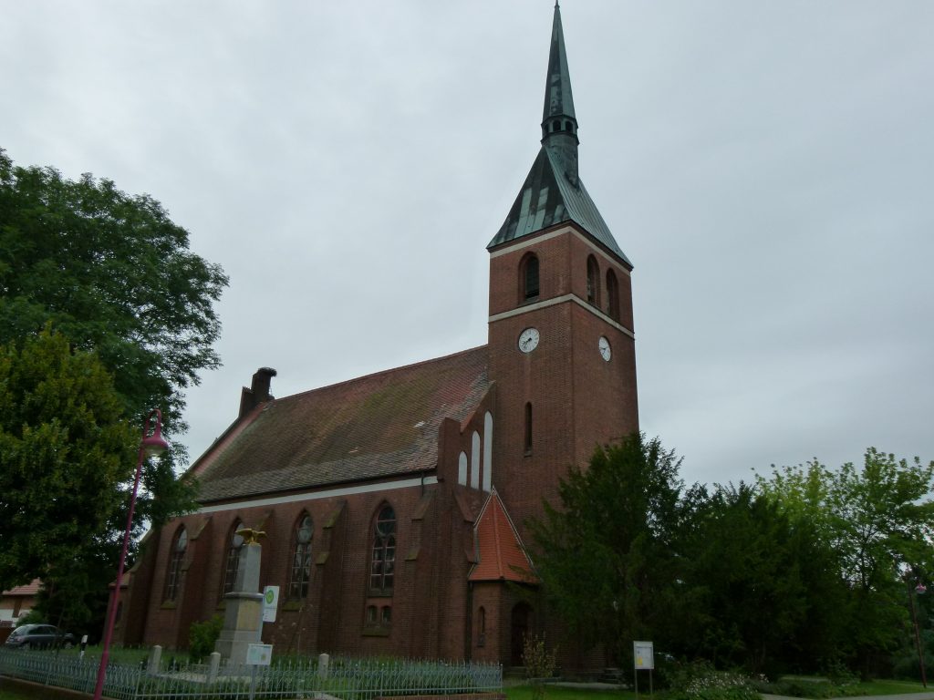 Die Kirche des Ortes, ein für die Region überdurchschnittlich großer Backsteinbau in neugotischer Formensprache, steht imposant in der Mitte des Dorfes. Nachdem ein Fachwerkbau von 1739/40 wegen Baufälligkeit abgebrochen werden musste, beginnen die Bauarbeiten für den Neubau nach einem Entwurf des Cottbuser Baurates Robert Beutler im Frühjahr des Jahres 1900. Bereits im November konnte Richtfest gefeiert werden und am 9. Oktober 1901 fand die feierliche Einweihung statt. Seitdem hat es kaum bauliche Veränderungen gegeben. Das Gotteshaus präsentiert sich als zweischiffige Hallenkirche mit einheitlichem Satteldach, eingezogenem Chor, mehreren seitlichen Anbauten und einem hohen Westturm mit oktogonalem Dachtürmchen, Laterne und Spitzhelm.