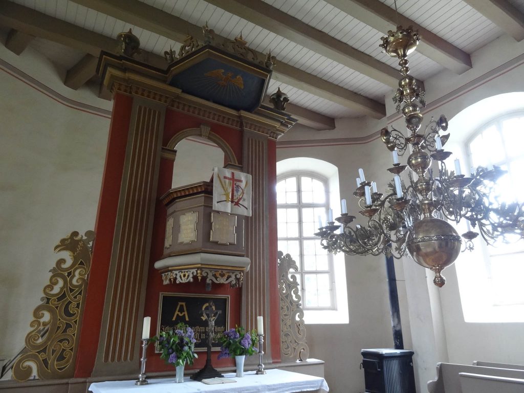| Verputzter Saalbau mit Fachwerk-Turmaufsatz um 1770, barocker Kanzelaltar | |