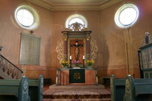 | Bau von 1914 im Stil des friderizianischen Barock, bauzeitliche Innenausstattung, Radleuchter, Dinse-Orgel von 1914 im Original erhalten, umfangreiche Sanierungsarbeiten am Turm und an der Orgel im Sommer 2020 abgeschlossen. | Mai bis zum Tag des Offenen Denkmals sonntgs von 14 - 17 Uhr offen. Der Förderverein Dorfkirche Gosen e.V. organisiert etwa monatlich Konzerte und Veranstaltungen. www.kirche-gosen.de |