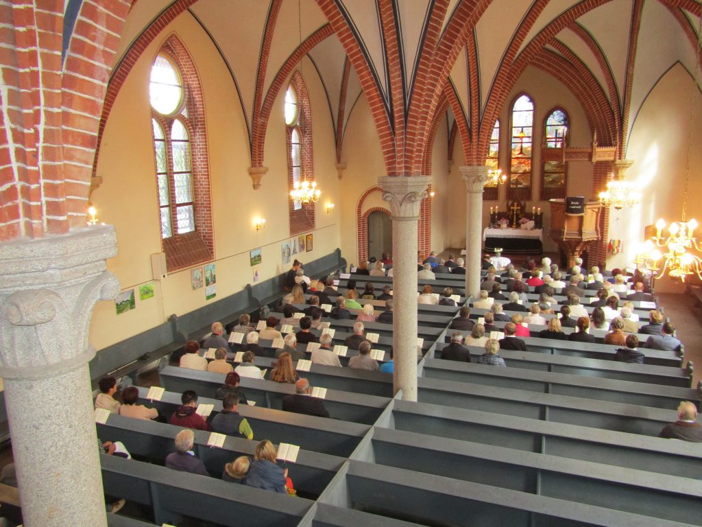 | Zweischiffiger, neugotischer Ziegelbau (1900/01), nach Kriegsbeschädigungen in den Jahren 1985-1993 erneuert, Ausstattung der Bauzeit | |