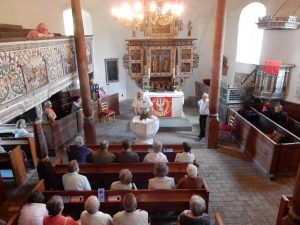 | Verputzter Feldsteinbau vom Beginn des 14. Jh. mit freistehendem Glockenturm, Renaissance-Altar und -Kanzel, qualitätsvolle Emporenmalereien, gotische Schnitzfigur "Christus auf der Rest" | |