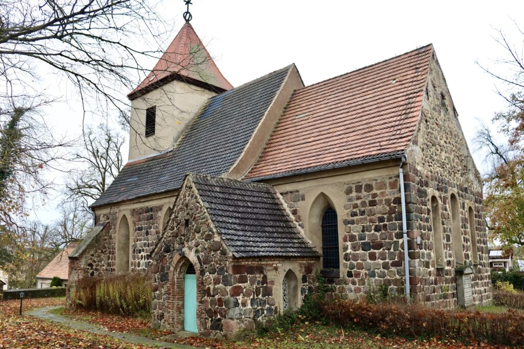 Verputzter Feldsteinbau aus der Mitte des 13. Jahrhunderts mit verputztem Turmaufsatz. Innenausstattung aus der Zeit des Wiederaufbaus nach 1959. |