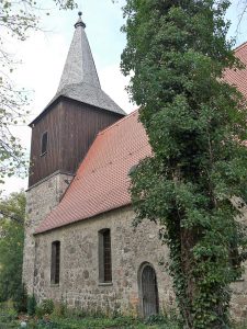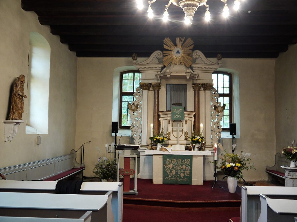 | Mittelalterlicher Feldsteinbau mit verbrettertem Turm von 1680, barocker Kanzelaltar von 1730, silberne Taufschale von 1860 |