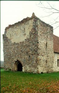 Die mittelalterliche Feldsteinkirche des Ortes brannte in den letzten Kriegstagen 1945 völlig aus. Der ehemals höchste Kirchturm der Region wurde bis auf den Turmstumpf abgetragen. Zu Beginn der fünfziger Jahre des vergangenen Jahrhunderts konnte zumindest das Kirchenschiff mit den bescheidenen, damals zur Verfügung stehenden, Mitteln wieder hergestellt werden. Damals leistete sich die Gemeinde sogar eine neue Orgel, die jedoch aufgrund eindringender Feuchtigkeit bald schon nicht mehr gespielt werden konnte. Die Gottesdienste der nur knapp 40 Mitglieder zählenden Kirchengemeinde fanden im benachbarten Pfarrhaus statt; der eigentliche Kirchenraum blieb Jahrzehnte lang ungenutzt.