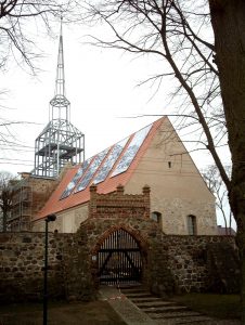 | Feldsteinbau des 13. Jh., barocker Turmaufbau 1945 zerstört, 2006 als Stahlgerüstbau (46 m) wiedererrichtet, vom Förderverein eingerichtete Gedenkstätte "Flucht und Vertreibung infolge des 2. Weltkrieges" | Besuche können vereinbart werden mit Frau Zillmer, Tel. 033333-30029, oder mit Herrn Lau, Tel. 033333-30242, Mail: karl.lau@web.de |