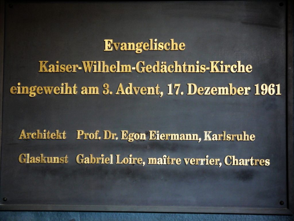 | 1895 als Denkmal für Wilhelm I. von F. Schwechten in neuromanisch/gotischem Stil, 1943 zerstört, 1961 Neubau von E. Eiermann, auch Altar, Taufe. Glasfenster von G. Loire aus Chartres |