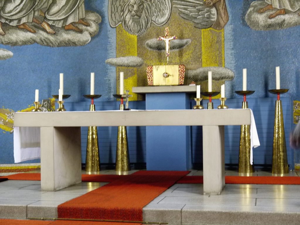 | 1933/34 von W. Fahlbusch gebaut, in der Apsis Monumentalmosaik "Verehrung des Lammes" | Der Kirchenschlüssel kann abgeholt werden Di - Fr von 9 - 14 Uhr im Pfarramt. |