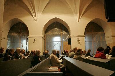 Feldsteinbau des 13. Jh. mit gotischem Sterngewölbe, Renaissance-Ausstattung. 2021 Sanierung abgeschlossen. |