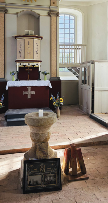 Als man sich im Jahr 2020 eigentlich nur mal den Dachstuhl genauer anschauen wollte, lagen danach geschätzte Kosten für eine Sanierung in Höhe von ca. 400.000 Euro auf dem Tisch. Der gesamte Dachstuhl musste erneuert werden, auch die Fenster, und auch das Mauerwerk musste trockengelegt werden. Es wurde eine Toilette in das Gemeindehaus eingebaut und auch dessen Dachstuhl brauchte Unterstützung. Der Großteil der Kosten wurde schließlich aus dem EU-Programm LEADER finanziert, mit dem Ziel, Kosilenzien zu einer „Gedächtniskirche“ werden zu lassen. Hier ist nun eine Ausstellung über das Leben im Dorf und seine Bräuche geplant, darüber, wie die Festtage im Kirchenjahr, Bestattungen, Hochzeiten gefeiert werden und wurden – damals und heute. Dazu gehört auch, dass seit Jahrzehnten in Kosilenzien zu Weihnachten von der Gemeinde selbst organisierte Krippenspiele stattfinden. Dann ist die Kirche voll. Bei etwas weniger als 200 Einwohnern sind 46 Gemeindeglieder immerhin etwa 25 Prozent Kirchenmitglieder im Ort! Dabei ist die Gemeinde stolz auf ihre Selbständigkeit. Anders als bei der Landeskirche EKBO, die von Gemeinden mindestens 300 Mitglieder fordert, verlangt die Landeskirche EKM, zu der Kosilenzien gehört, nur mindestens vier gewählte Gemeinderatsmitglieder. Beim geselligen Zusammensein nach der Andacht wurde deutlich spürbar, dass es in Kosilenzien Menschen gibt, die sich kümmern und ein aktives, organisiertes Dorf gestalten. Die Kirchengemeinde hat ein kleines Gemeindezentrum, die Dorfgemeinde ein größeres und natürlich gibt es auch die Freiwillige Feuerwehr. Alle drei liegen nebeneinander. Gegenüber befindet sich auch noch eine Gaststätte, auf die man besonders stolz ist, denn welches Dorf hat sie noch?