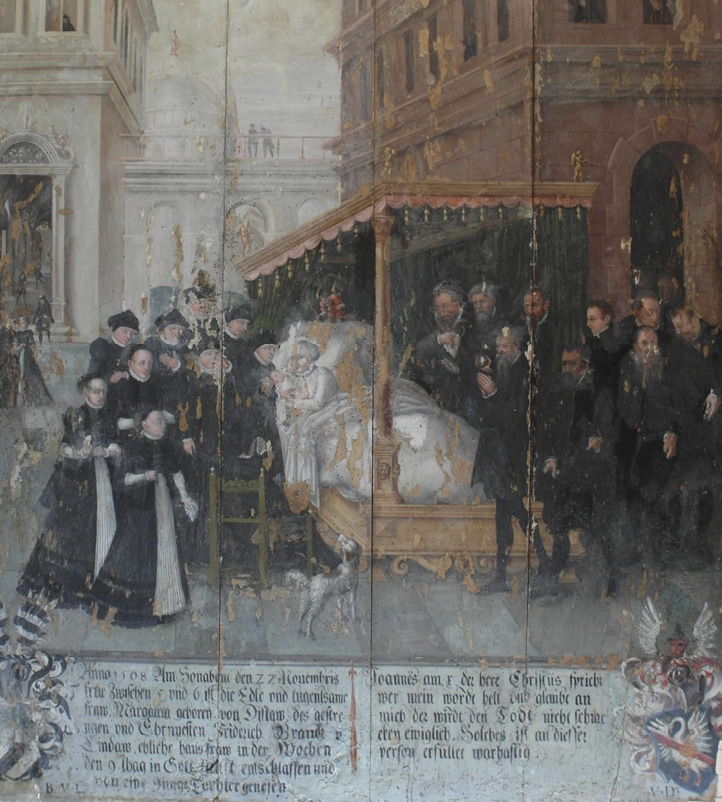 Im Querschiff der St. Marienkirche in Wiesenburg hat das Holzepitaph der Margareta von Dieskau seinen angestammten Platz. Es wurde bei jeder Kirchenführung gezeigt und sein geschichtlicher Hintergrund erklärt: Dass die Schlossherrin im Jahre 1568 im Kindbett starb und auf dem Bild ihr Töchterchen weggeben musste, während sich die trauernden Verwandten rechts und links des Bettes versammeln und im Hintergrund das Leben weitergeht.