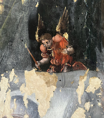 Nach einer kurzen Zeit in einer Begasungskammer konnte im August 2025 in der Werkstatt der Restauratorin Andrea Himpel in Halle (Saale) die Restaurierung begonnen werden. Neben der Stabilisierung der Holzsubstanz und der Malschichtenkonsolidierung wurden die älteren, sehr vergilbten Firnisschichten und Übermalungen mit einem Lösungsmittelgemisch abgenommen. Es zeigte sich, dass darunter eine viel hellere und detailreichere Malerei zum Vorschein kam. Spätere Übermalungen haben viel verdeckt. Diese wurden entfernt. Außerdem wurde die Innenseite des Rahmens neu vergoldet.