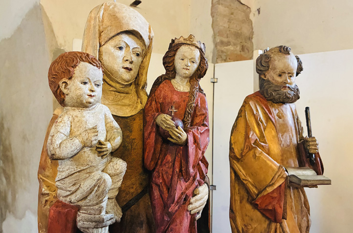 Geipel: Natürlich waren die gut 30 Jahre, bis die Restaurierung abgeschlossen werden konnte und in denen sie bei mir lagerten, eine Herausforderung und Besonderheit. Es gab auf den Skulpturen insgesamt vier Farbfassungen. Ich habe die jüngste aus dem 19. Jahrhundert entfernt, weil sie nicht auf den Gewandverlauf Rücksicht nahm und Farben, wie zum Beispiel Grün, verwendete, die man früher an Gewändern nicht benutzte. (Anmerkung: Diese Übermalung war von Amtsgerichtsrat Franz Kuchenbuch, dem Leiter des Müncheberger Museums 1867 selbst aufgetragen worden). Seine Grundierung habe ich belassen, zum Schutz der darunter liegenden älteren Fassungsreste, deren Umfang unbestimmt ist. Nach den Befunden konnte ich die originale Farbgebung weitestgehend rekonstruieren. Die Gesichter von Skulpturen werden selten überstrichen, sondern oft nur gereinigt. Leider erfolgt diese Reinigung oftmals zu aggressiv, sodass nur noch die weiße Grundierung oder Untermalung erhalten sind. Weißpigmente sind auch sehr beständig. Die Gesichter zeigen ja den Charakter der Figuren. Die Gesichter von Petrus und Anna Selbdritt könnten also fast noch die Originalfassung besitzen, wenn auch nicht mehr vollständig. Diese habe ich erhalten.
